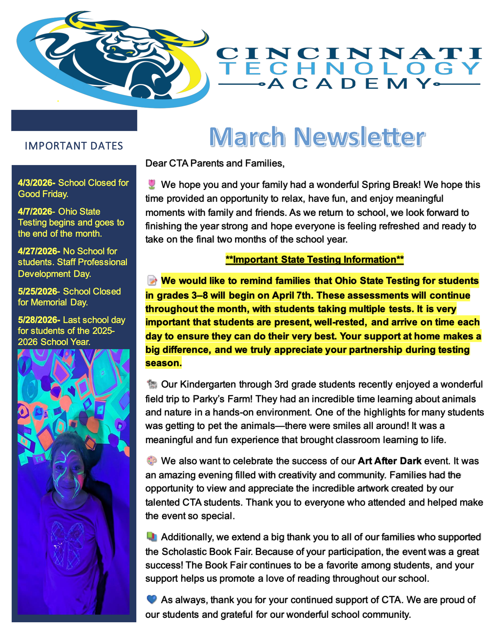 Please take a moment and download our newsletter to read more about these stories, our Art After Dark Event, Scholastic Book Fair, and important upcoming calendar dates.